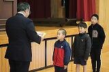 全校集会で二つの表彰をしました。一つ目は春先に実施した体力テストの結果を受け、体力賞「A」を1年生2名と4年生の計3名が受賞しました。これは、「年齢に対し素晴らしい体力が身についている」というもので、とても基準となる数値が高く、受賞のハードルが高いものです。二つ目は人権ポスターで6年生児童が受賞しました。それぞれ得意な分野で力が発揮できてよかったですね。