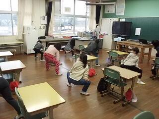 朝の時間、立腰体操の放送が流れます。各学級でみんな一斉に四股を踏む姿勢で体をひねったり、手を背中側で組みながら体を前屈させ手のひらを上に向けたりするなど簡単なストレッチ運動を行います。立腰を意識した正しい姿勢をとることは、健康な体を育むためにも大切にしたいことです。小さな積み重ねが将来の宝物になると考え、継続しています。