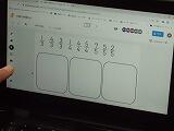 4年生の算数の学習、9個の分数の仲間分けをしています。「分母が同じ」という分け方は先生が提示し、今日はこれと違う分け方を考えるという学習です。みんなタブレット上で操作をして決められた枠の中に分数を並べていきます。最終的に「分母が分子より大きいもの」、「分母と分子が同じもの」、「分母が分子より小さいもの」の3グループに分けられました。これがこれから何年ものつきあいになる真分数や仮分数の基本的な考え方に結びつきます。画面上であれば試しに数の入れ替えがどんどんできるのもICTのよさの一つです。