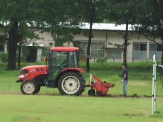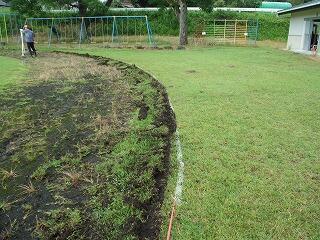 始業式前日の8月27日(日)、PTA会長、副会長と環境事業部長、副部長の皆様が運動場の整備を進めてくださいました。本校の運動場は全面に芝(草)が生えており、夏の時期になるとトラック部分にも根を伸ばしてきます。子どもたちがこれから運動会の練習で使うこの場所をきれいにするため、コースの切り出しを行っていただいたものです。今後、予定されている奉仕作業等で整備を重ね、きれいになった運動場で精一杯子どもたちが走り、体力向上を進めていきます。ありがとうございまいた。