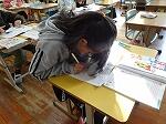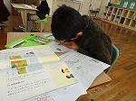4年生は算数で、小数倍の学習でした。具体的には、「赤のリボンは28cmで、青のリボンは20cmです。赤のリボンは青のリボンの何倍ですか」といった問題に挑戦していました。整数の場合と考え方は同じですので、その考え方をもとにして解いていきますが、やはりワンステップ難しいので、考え込む子もいました。テープ図等をヒントとしてがんばって解いていました。
