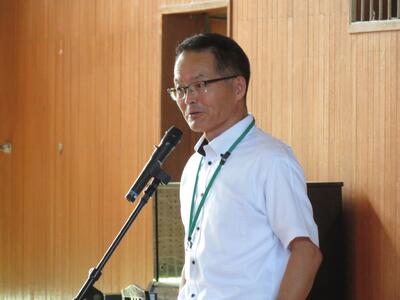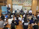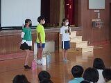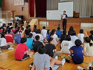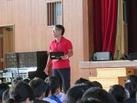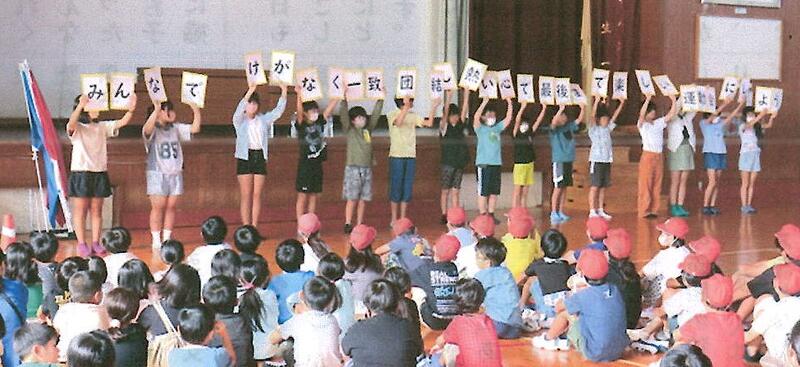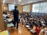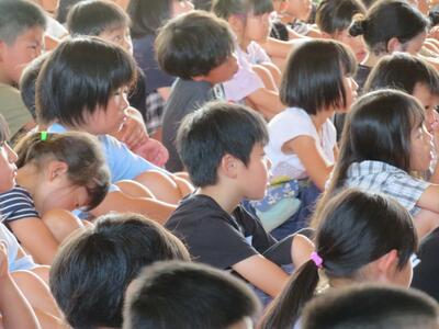 当日は、体育館にて全校集会が行われましたが、転入生の紹介に引き続き、赤﨑校長より「運動会などの大きな行事も見据えて、目標をもってがんばっていきましょう。」と話があり、子どもたちも暑い中、真剣に耳を傾けていました。