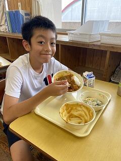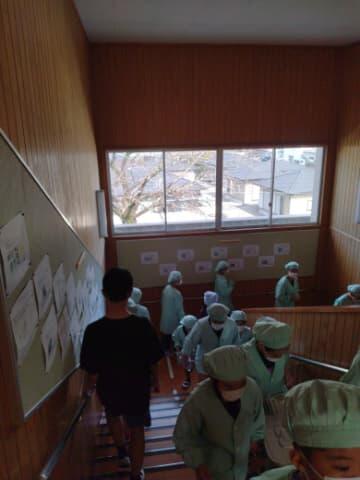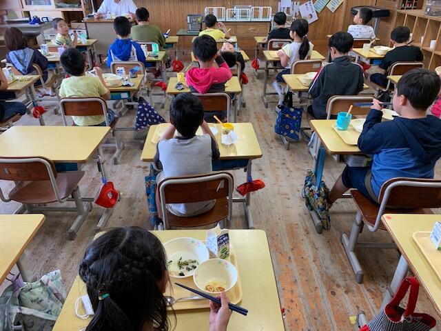 給食は、グループを作らず、全員前を向いて静かに給食を食べています。