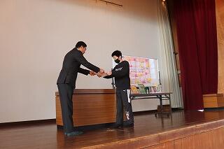 さらに、本校が、令和6年度の体力づくり優良校に選ばれ表彰されましたので、そのときに授与された盾の紹介がありました。