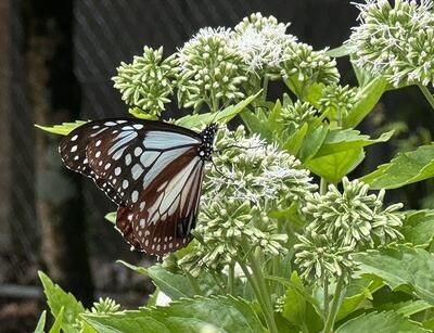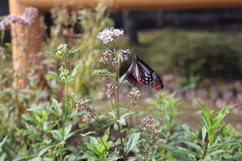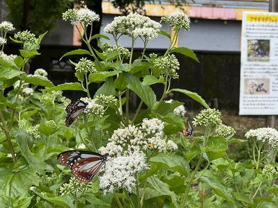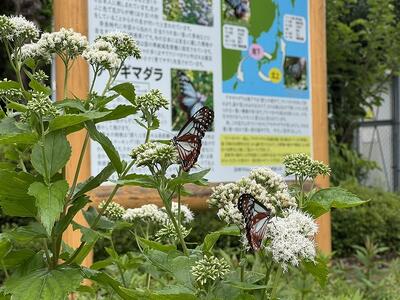 飛来する蝶としてアサギマダラが本校にはやってきます。限られた植物にしか飛来しないため、その一つの植物であるフジバカマを正門横の花壇に植栽してアサギマダラがやってくるのを楽しみにしています。フジバカマは10月頃に花が咲くためこの時期には飛来しないですが、今年は地域の方の協力を得て、4月から7月に咲くと言われるシマフジバカマをいただきました。この植物にもアサギマダラがこの時期やってくる限られた植物です。