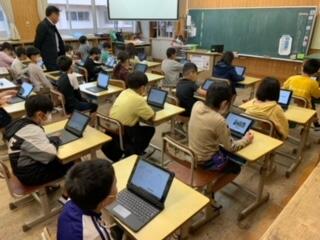 さて、今日の3校時、いくつかの学級・専科教室では、タブレットや投影機、電子黒板等のICT機器を活用して学習が行われていました。