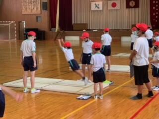 体育館では、1年生一学級が体力テストを行っていました。ちょうど、「立ち幅跳び」と「長座体前屈」に取り組んでいました。マスク着用のもと、6年生の皆さんがペアとなって、優しく、分かりやすく、運動の説明や練習の仕方、運動結果の記録などの補助をしていました。