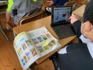 また、外国語活動室では、世界の国々の国旗や写真をもとに「Where do you want to go?」の問いかけに、「自分の行きたい国とそのわけ」をタブレットも活用しながら、英語を使って学習を進めていました。