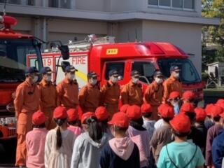 消防車3台を前に、「人々の命と財産を守る」ための消防署の役割を学ぶことができました。