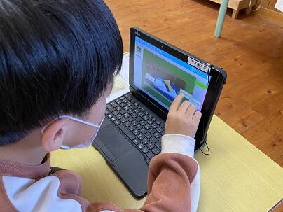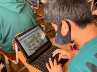 単元名は「Where is your treasure?(宝物はどこですか?)」。今日は2人組になって宝物のありかを英語で「道案内」をする学習でした。right(ライト)やleft(レフト)、straight(ストレート)などの単語を駆使して、タブレットを活用しながら宝物のありかまで上手に案内していました。