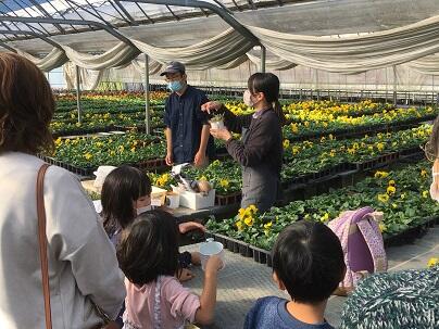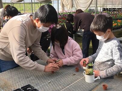 講師の先生の丁寧な指導のもと、親子で「寄せ植え」を楽しむ姿がありました。