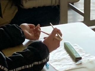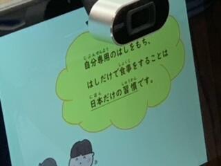今朝は、給食週間にちなんで、本校の学校栄養士がオンラインで「はしのもち方~おはし名人になろう~」について話がありました。「①正しいはしのもち方 ②正しいはしのもち方が大切なわけ」について、実演や資料を提示しながら分かりやすく話をしてもらいました。子供たちも真剣な表情で、自分のはしを使って、正しいはしのもち方を確認していました。