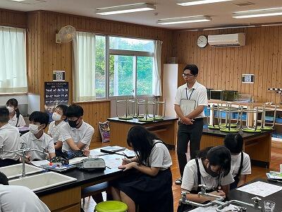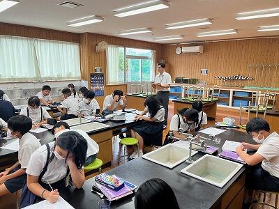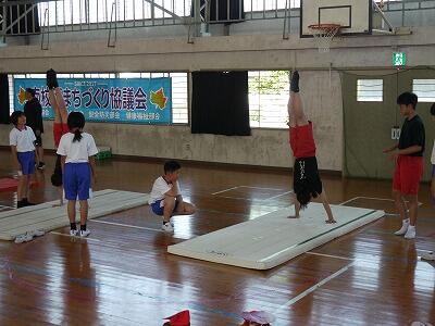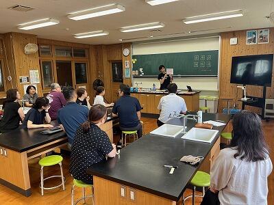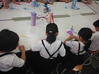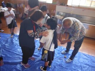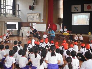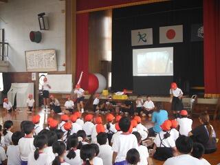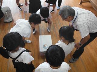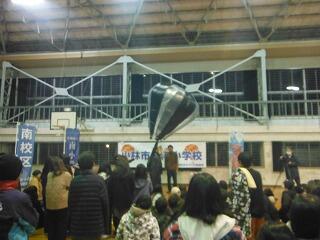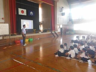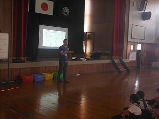 初めに、宮崎大学気球部による講座が体育館で開かれました。気球がなぜ浮かぶのか?などについて、説明や実験を通して分かりやすく説明していただきました。子どもたちも初めて知る仕組みに驚いている様子でした。
