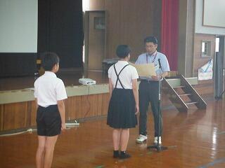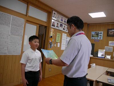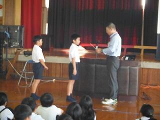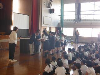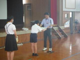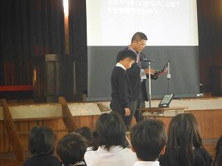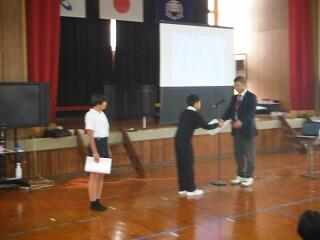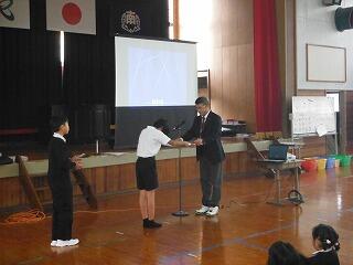 最後に、小林市図書館読書感想文・感想画コンクールの入賞者の紹介と表彰を行いました。本年度も感想文が7名、感想画が5名の入賞していて、とてもすばらしいです。読書感想文については、お昼の放送で紹介し、感想画については校内に掲示して、みんなに紹介する予定です。