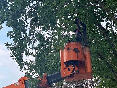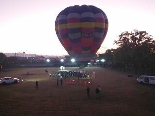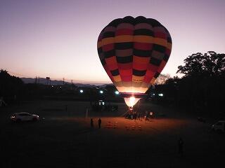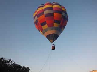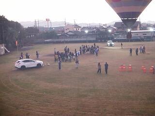 そして、運動場に出て熱気球体験を行いました。気温はやや低かったですが、雲一つない快晴で風もほとんどなく、絶好の気球日和でした。3人ずつ気球に乗り、約12・3m上空まで上がって登ってくる朝日や周りの眺めを楽しんでいました。ほとんどが初めての経験で、とてもうれしそうでした。