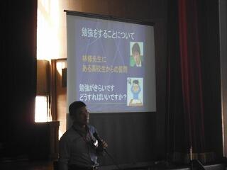 成澤さんは、「世界一明るい視覚障がい者」というキャッチコピーで知られ、様々な場所で講演をされている方で、今回は「一歩踏み出す勇気の育て方」と題して、様々なお話をしていただきました。