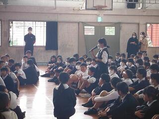 まず、校長先生の話では、12月4日~10日までが「人権週間」であることに関連して、「人権」に関するお話がありました。「人権」が「自由に考え、行動し、幸福に暮らせる権利」であり、例えば「自分の気持ちが大切にする権利」「安全に暮らす権利」「仲良くなる権利」「学ぶ権利」などであることや、「人権を奪われた家族の話」として北朝鮮拉致問題の話をしました。ある日突然拉致され、人権を奪われた本人の気持ちや、娘を奪われた家族の気持ちなどに触れ、48年経った現在も解決していない問題であることを伝えました。そして、拉致被害にあった家族は、「拉致されたままの人がいることを知ってほしい」「この問題に関心をもってほしい」という思いをもっていることを伝えました。