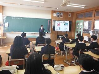今回は、「薬物乱用防止」に関する内容を中心に、プレゼンテーションを使って分かりやすく説明をしてくださいました。薬物の体や心に与える影響や、薬物がとても身近にあること、関わると犯罪になり警察に捕まることなど、具体的なお話を聞くことで、たくさんのことを学び取っていました。