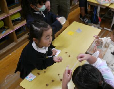 自分たちで拾いに行ったドングリを使って、いろいろな遊びを準備していました。