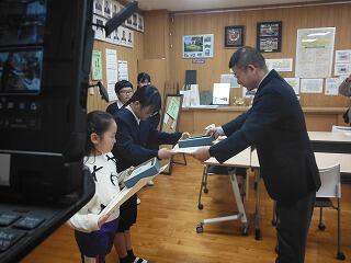 最後に、表彰を行いました。今回は、「県統計グラフコンクール 県教育賞」「税に関する絵はがきコンクール 南九州税理士会小林支部長賞」「JA書道コンクール 条幅の部銅賞、半紙の部佳作」に選ばれた児童へ表彰でした。賞状と記念品を校長先生から受け取り、学級で見ている児童から大きな拍手を受けました。受賞者の皆さん、おめでとうございました!