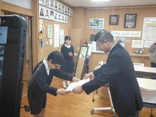 次に、生徒指導主事担当から、「冬休みの過ごし方」について話しました。「車」「火」に気を付けることや、メディアを使った事件に巻き込まれないことなどについて、具体的に指導をしました。事件や事故に遭うことなく、安全に楽しい冬休みにするために、決められたルールをしっかり守って過ごしてほしいと思います。