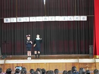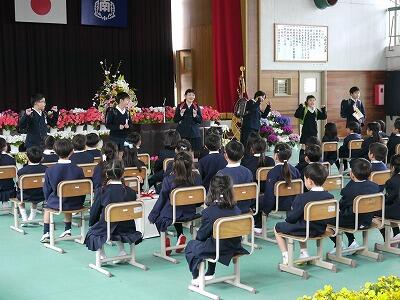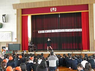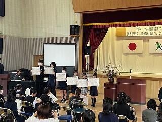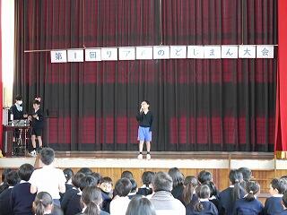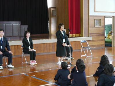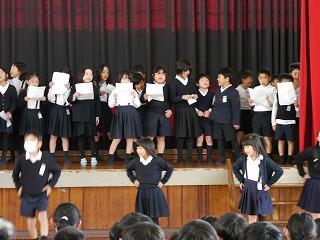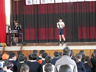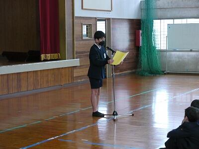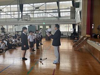 児童代表挨拶です。「学校全体のリーダーになる」「誰に対しても優しくする」「テストで90点以上とる」などの宣言をしていました。素晴らしい目標だと思いました。
