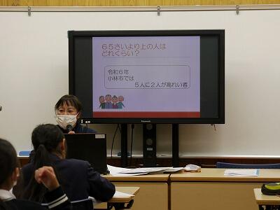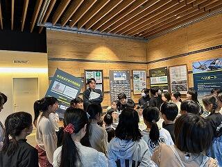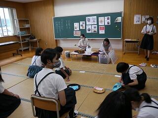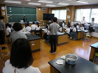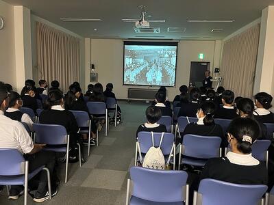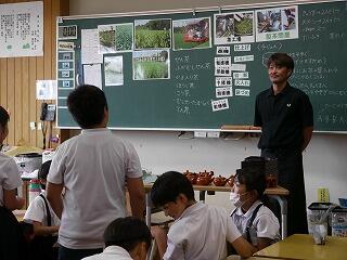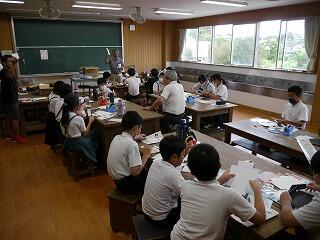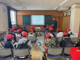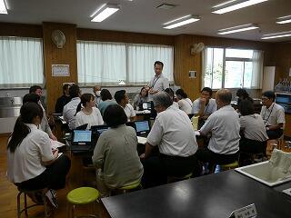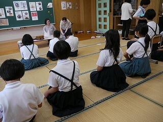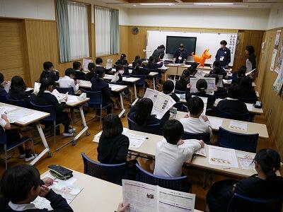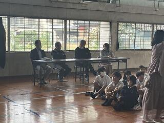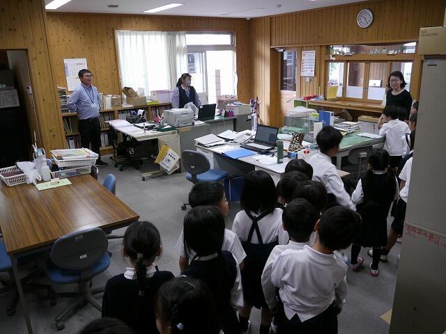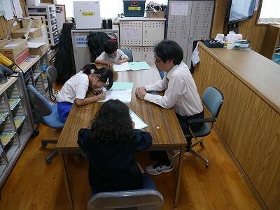 次の写真は、「職員室はどんな場所なのか?」を2年生が教頭先生に尋ねているところです。