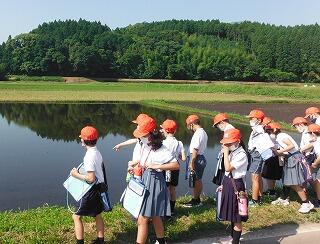 今日、3年生は、社会科学習として学校のまわりの様子を調べるために、校外学習へ出かけました。南小は町場の中にある学校ですが、少し歩くと田園風景が広がっています。学校の南側の田んぼや畑の様子を見て回りました。暑い中の見学でしたが、みんながんばって歩き、学校のまわりの様子を知ることができました。