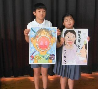 今日の朝、全校朝会が行われました。その中で、県の「歯・口の健康に関するポスターコンクール」の表彰がありました。なんと!南小の5年生が、小学校上学年の部において、1位と2位をとりました。1位は杉場新さん、2位は後藤はるのさんです。大変素晴らしい作品で、全校児童の大きな拍手を浴びました。1位の作品は、全国審査へ送られることになるそうです。おめでとうございます。