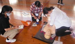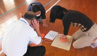 今日は、児童を下校させた後、職員で心肺蘇生法研修会を実施しました。例年、外部から指導者を招聘していましたが、コロナ感染対策により、指導者を呼べないため、職員のみの研修を行いました。ビデオを視聴した後、実際に児童が倒れて救急車が到着するまでの一時救命として、心臓マッサージの仕方、AEDの使い方を練習しました。水泳指導前に、もしもの場合でも冷静に連携して行動できるよう有意義な研修をすることができました。