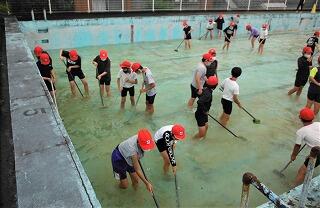 今日は小雨降る少し肌寒い1日でした。そんな中、6時間目に6年生がプール清掃を行いました。大プールと小プールに分かれて、デッキブラシで床や壁をこすりました。短い時間でしたが、みんなのために一生懸命プールをきれいにしてくれました。プール開きは6月21日です。