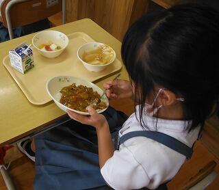 入学して5日目の今日、1年生は初めての給食でした。献立は、ミルクパン、スパゲティミートソース、サラダでした。口の周りを真っ赤にしておいしそうに食べていました。おかわりをする子もいたようです。これからの学校生活の一つの楽しみになったことでしょう。