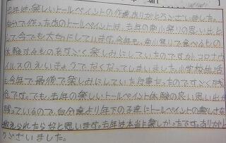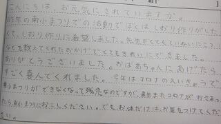 少し前まで暑いくらいの陽気でしたが、今週から、急に気温が下がり、朝夕は寒さを感じます。体調を崩している児童も多いようです。本来なら今週日曜日は「南小まつり」が開催されるはずでした。しかし、新型コロナウイルス感染拡大防止のため、本年度は中止となりました。そこで、来年度の「南小まつり」につなげるために、3年生以上で昨年度の「南小まつり」の指導者の方々へ手紙を書きました。手紙から子どもたちの思いが伝わってきました。来年度は開催できますように。