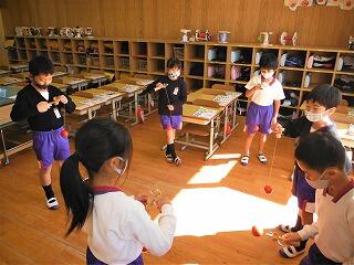 今朝はこの秋一番の冷え込みで、気温は6℃、寒い朝でした。1年生は生活科「昔の遊び」を学習しています。竹とんぼ、けん玉、かんぽっくり、あやとりなど教室と運動場に分かれて楽しんでいました。明日は1年生から5年生は「秋の遠足」です。「春の遠足」は実施できなかったので、みんな楽しみにしています。