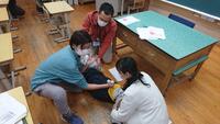 正解は、眼科検診です。▼学校医の先生に2日間来校いただきました。▼検診は、下学年と上学年に分けて、体育館で一気に行います。▼効率的に行うために、お医者さんの前に立った時に各々がどのような動作をするのか、事前に指導します。▼1年生もおりこうに、立派にできていました。(^^)v【校長】