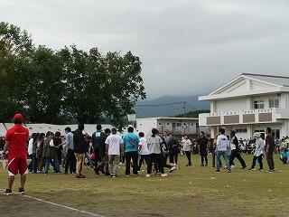 団長を中心にして、リーダーが応援の仕方を教えています。