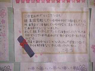 卒業が間近に迫った6年生に、他の学年からのメッセージが階段に掲示されています。各学年とも趣向を凝らし、6年生への思いが綴られています。6年生は一人一人の言葉を食い入るように読んでいました。卒業式は1週間後です。
