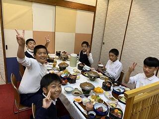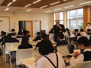 今日は、市が主催する「シェフのこばやし食育教室」に6年生が参加しました。KITTO小林において、ここやっど小林のシェフ地井潤さんの話を聞きながら、創作料理をいただきました。鯉のカルパッチョ、豆腐ステーキ、生ハムのメロン巻き、サラダ、黒豚ロースト、フレンチおでん、フレンチご飯、デザート等たくさんの料理を食べました。食材は全て小林産だそうです。6年生は、先週の修学旅行に続いておいしい食事を堪能しました。