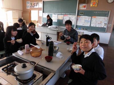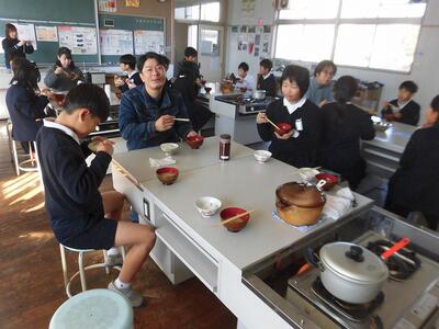 3校時には、いつもお世話になっている細野まちづくり協議会の方々をお招きし、5年生が作ったご飯とみそ汁を試食していただきました。
