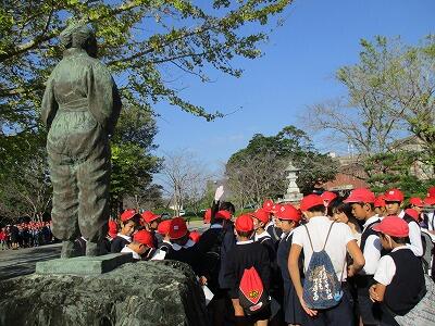 な桜島を見ながら子どもたちは、西郷隆盛さん
