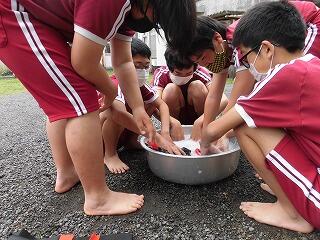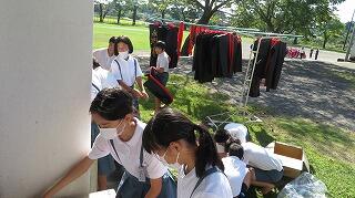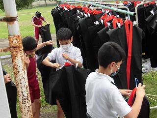 体育の授業で身に付けた法被をみんなで手洗いしました。