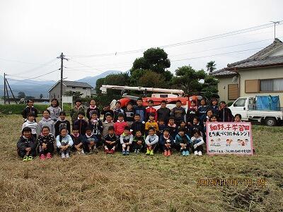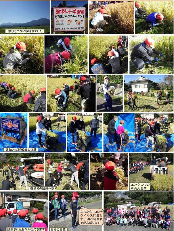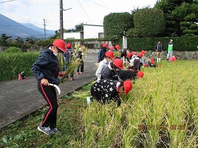 5か月前、泥んこになりながら植えたもち米の苗が大きく成長し、稲穂が見事に実りました。まちづくり協議会、JA青年部、そし て保護者や地域の皆さんから支援していただきながらの稲刈りです。鎌を使っての稲刈りと同時に、足踏み式脱穀機の体験をし たり、コンバインでの刈りとりや脱穀を見学したりと、米作りの歴史や現代の農業の状況なども学ぶよい機会となりました。