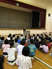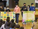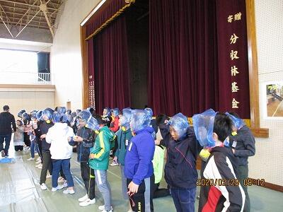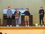 「6年生クイズ」や「じゃんけん列車」などを楽しんだ後、5年生が手作りした「ドラえもん」変身衣装で6年生と1年生が「ドラえもん」に変身して、全校児童で「ドラえもん」の歌を歌い、楽しいお別れ集会となりました。