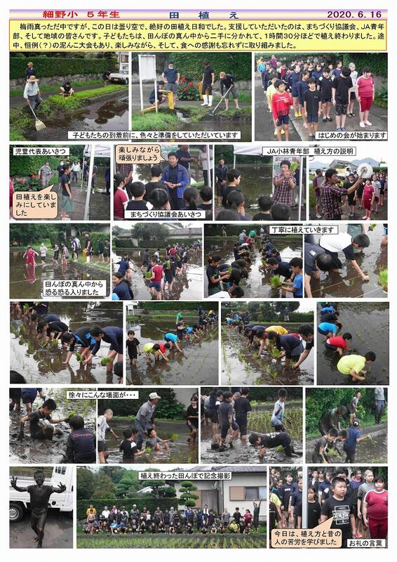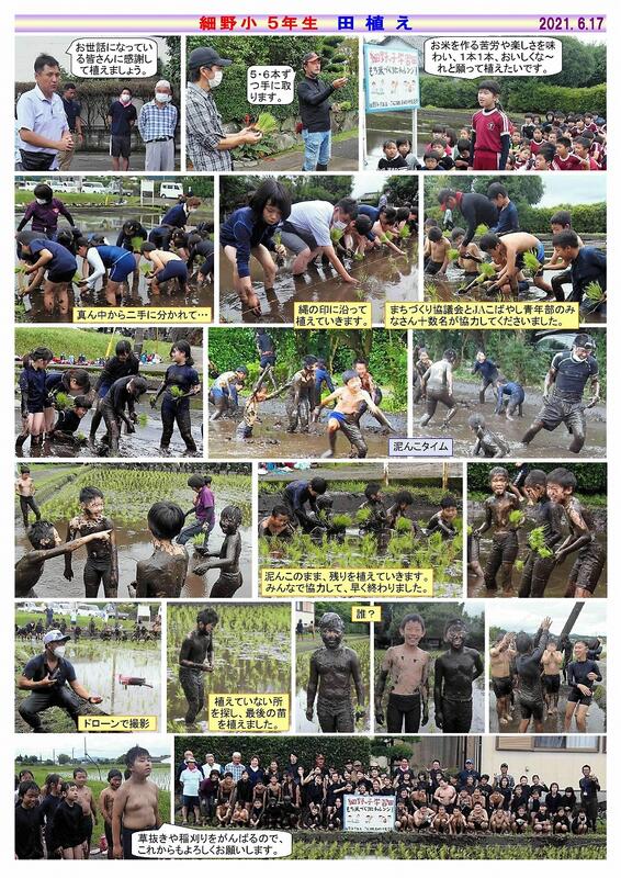 細野まちづくり協議会、JA青年部、そして地域の皆さんの協力のもと5年生の田植えが行われました。コロナウイルス感染症の影響で行事等の中止・延期・縮小等のある中、本日、無事に田植えができ大変嬉しく思います。ドロナパワーで元気いっぱいの子供たちでした(*^_^*)