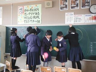 3月25日(月)の卒業式で、6年生に気持ちよく旅立ってもらおうと、5年生が協力して校舎の清掃や6年生の教室の飾りつけをしました。写真は黒板アートに挑戦している場面ですが、卒業生に喜んでもらおうと何日も前からデザインやイラストを考え、後輩としてできる精一杯の感謝の気持ちを込めてチョークを握っていました。