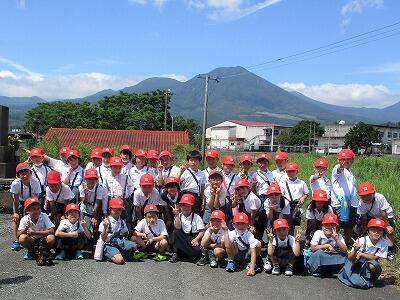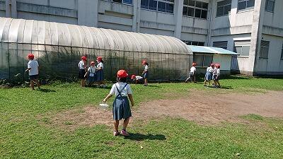 校区内を歩き、自然や地区の様子を観察して調べました。いい天気の中で活動できました。暑い日だったので、こまめに休憩し、水分補給も十分に行い、元気に探検をすることができました。