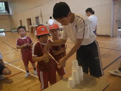 7月14日、細野中学校の3年生との交流会が行われました。細野中学校の3年生のお兄さん、お姉さんが計画してくれたボーリングやゴム鉄砲、紙飛行機、フルーツバスケット、ハンカチ落とし等のゲームを楽しみました。お兄さん、お姉さんの優しさにふれ、1年生はとても幸せな時間を過ごすことができました。
