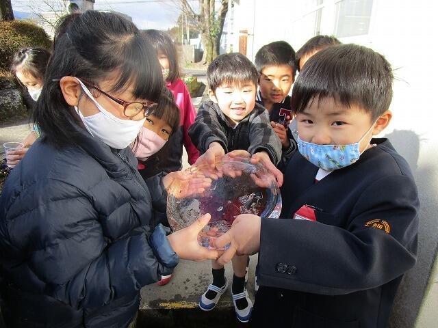 子どもたちは「実験」と言って、プラスティックコップに水を入れて氷ができるかどうか準備をしていました。そして、とても寒さが厳しかった朝、登校してすぐに見に行くと・・・カチカチの氷ができていて大喜び!!その日は、とても寒かったので帰る頃まで霜柱を見つけて、踏みしめた音を楽しんだり、手に持って喜んだりしました。