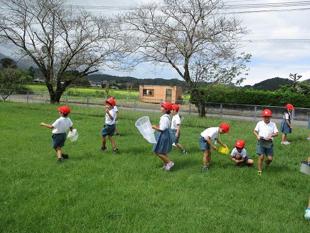 生活科の時間に、なかよしの杜や運動場で虫とりをしました。子供達は、真剣な表情で虫を探し、目を輝かせながら虫を追いかけていました。バッタやコオロギ、トンボをつかまえていました。生き物や自然に触れ合い、楽しい時間を過ごしました。