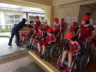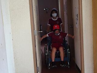 車椅子体験では、押す側と乗る側を体験しました。扉を開けることや舗装されていない道、階段など通行に困る場面がたくさんあることに気付きました。